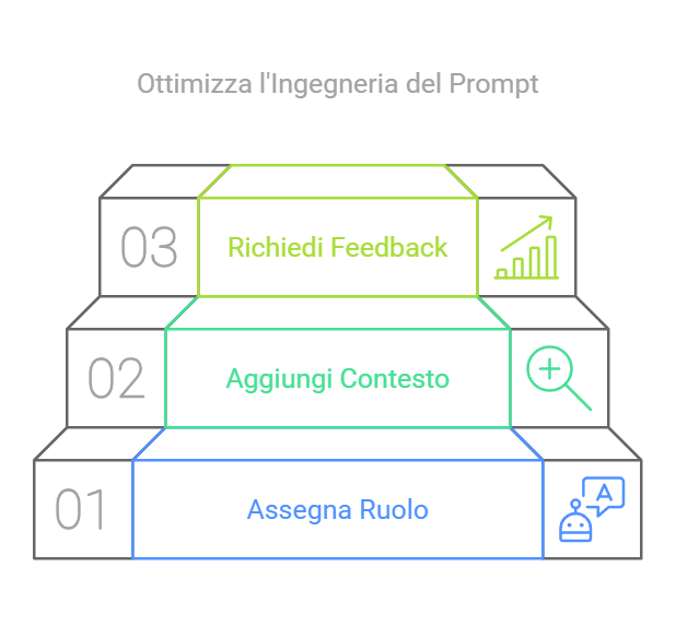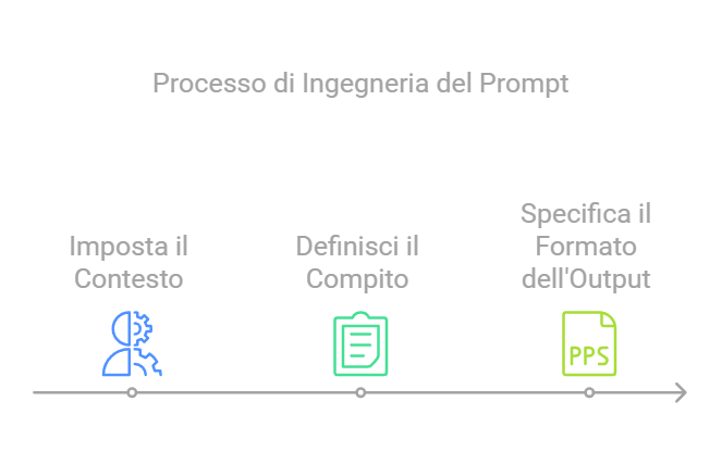 In parole semplici, si tratta di sapere esattamente cosa chiedere all’AI e come farlo. Non basta dire: “Aiutami con questo problema.” Bisogna strutturare la domanda in modo che l’AI capisca il contesto, il compito e il risultato desiderato. Ecco un esempio concreto: