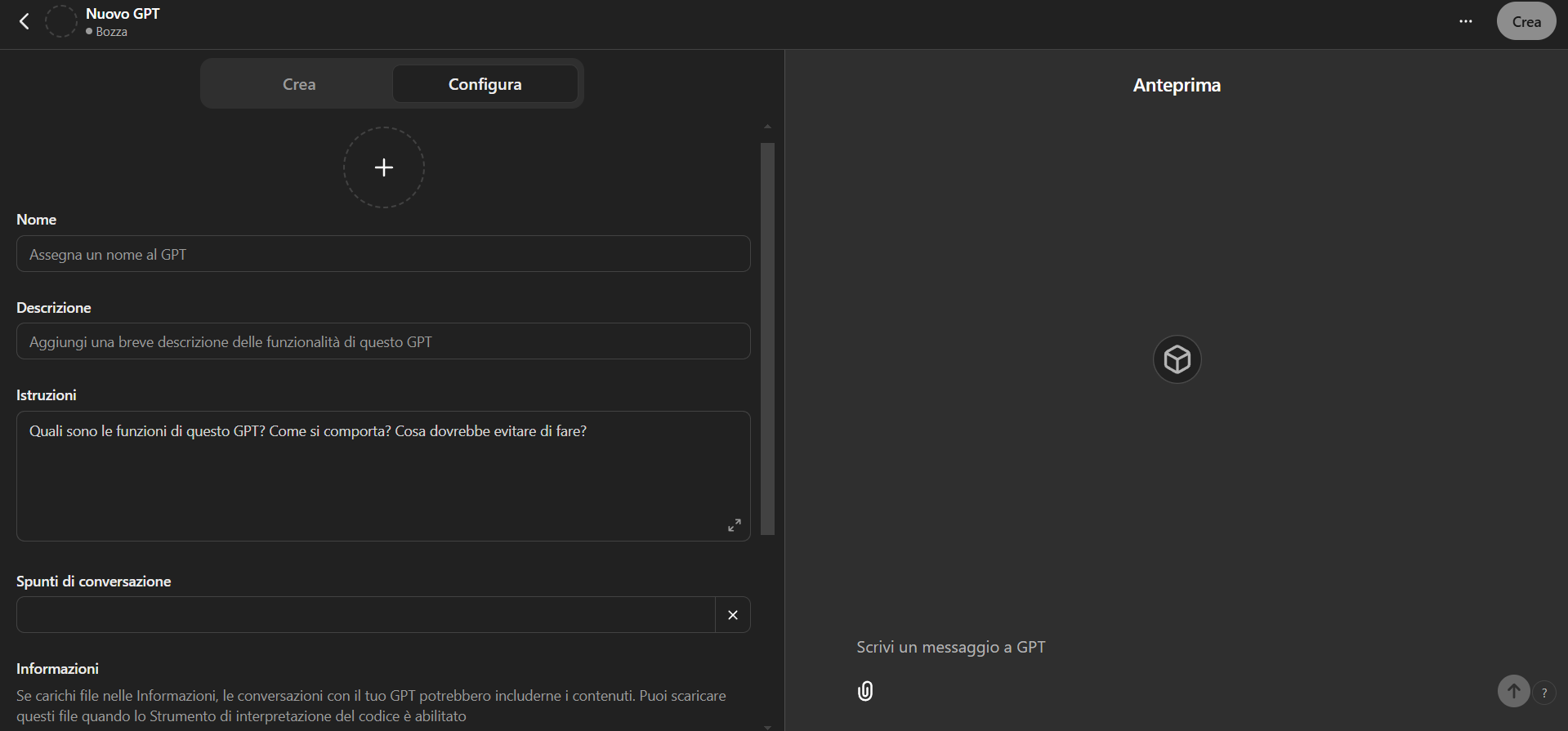 - Clicca su "Configura" e definisci chiaramente lo scopo del tuo GPT