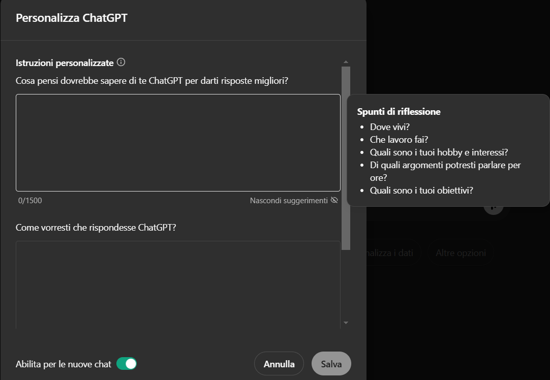 Questi campi ti permettono di insegnare a ChatGPT le tue preferenze una sola volta e di farle ricordare per sempre.